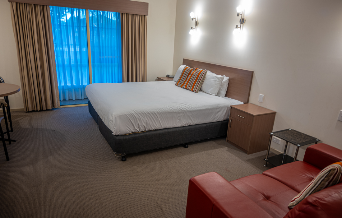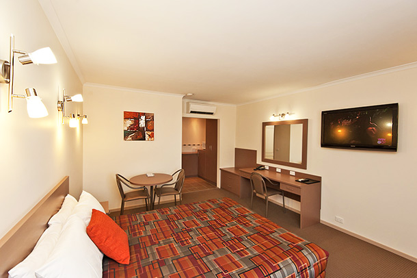 Spacious suite featuring a king bed to accommodate one or two guests. Room features a 42" Flat Screen TV/Foxtel. FREE Wi Fi. Reverse cycle air conditioning Kitchenette includes Fridge/Microwave. Crockery, Cutlery, Tea/Coffee making facilities. Iron/Full Ironing Board. Ensuite. All Non-Smoking.
