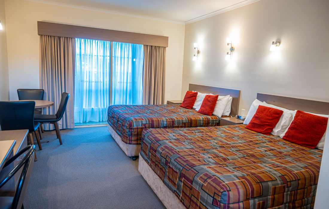 Spacious suite featuring two Queen bed to accommodate two or four guests. Room features a 42" Flat Screen TV/Foxtel. FREE Wi Fi. Reverse cycle air conditioning. Kitchenette includes Fridge/Microwave. Crockery, Cutlery, Tea/Coffee making facilities. Iron/Full Ironing Board. Ensuite. All Non-Smoking