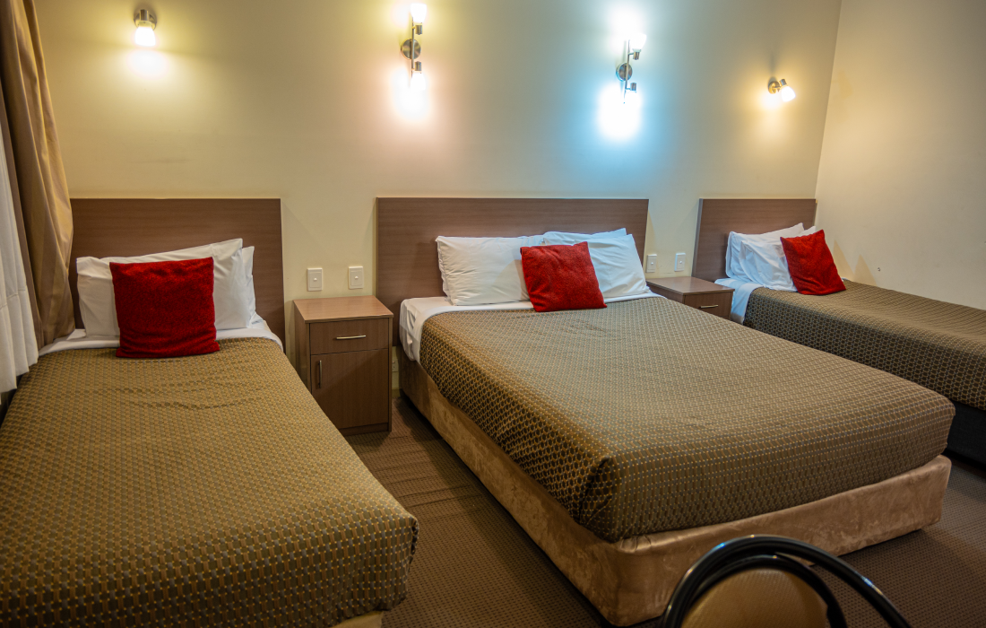 Spacious suite featuring a Queen bed and two Single bed to accommodate four guests. Room features a 42" Flat Screen TV/Foxtel. FREE Wi Fi. Reverse cycle air conditioning. Kitchenette includes Fridge/Microwave. Crockery, Cutlery, Tea/Coffee making facilities. Iron/Full Ironing Board. Ensuite. All Non-Smoking