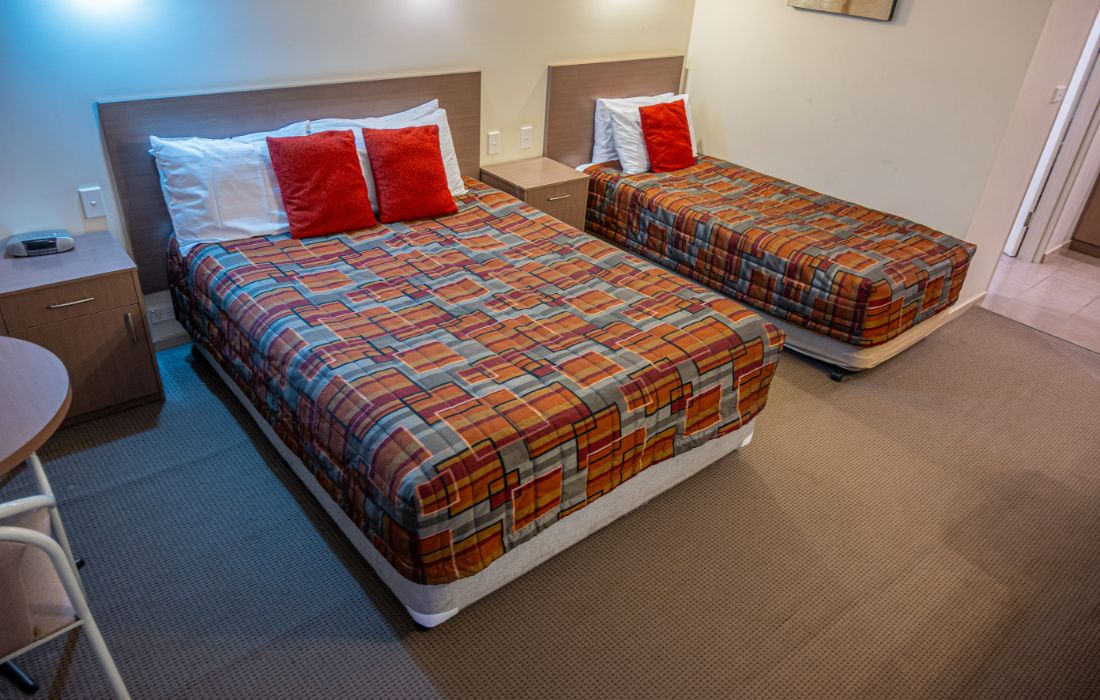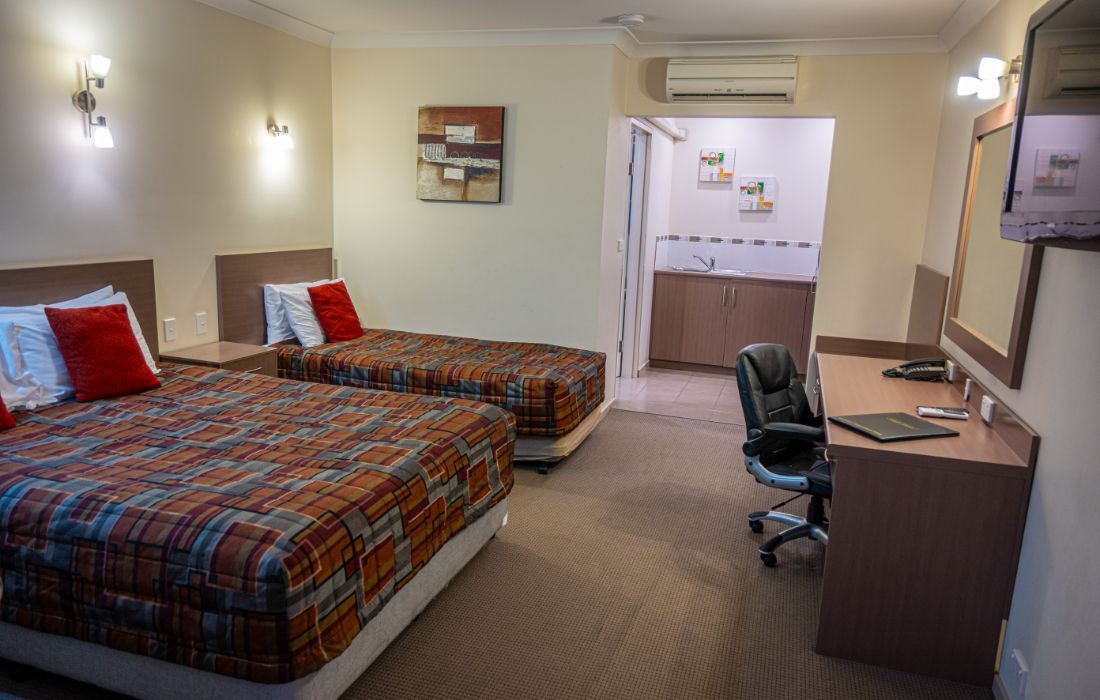 Spacious suite featuring a Queen bed and one Single bed to accommodate three guests. Room features a 42" Flat Screen TV/Foxtel. FREE Wi Fi. Reverse cycle air conditioning. Kitchenette includes Fridge/Microwave. Crockery, Cutlery, Tea/Coffee making facilities. Iron/Full Ironing Board. Ensuite. All Non-Smoking